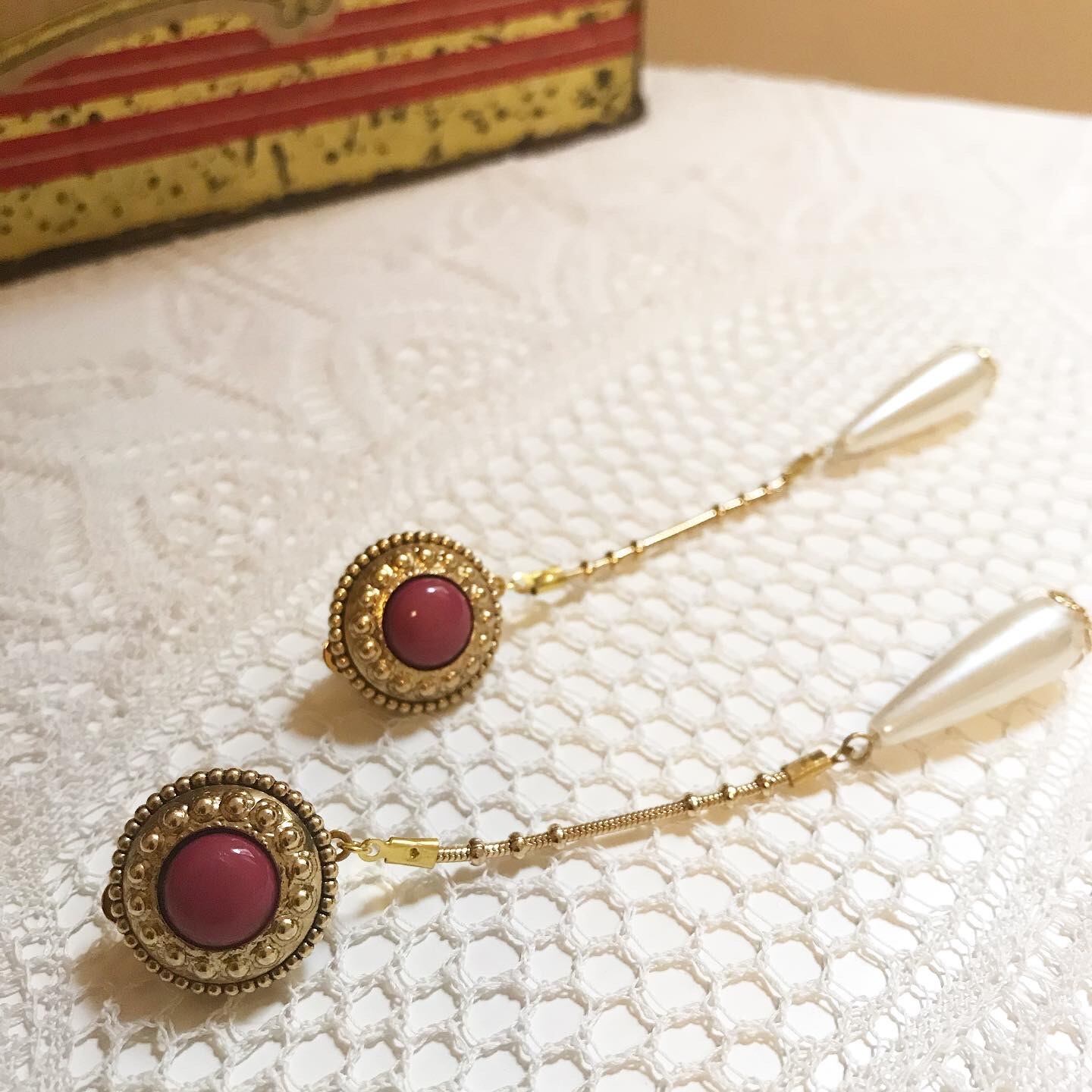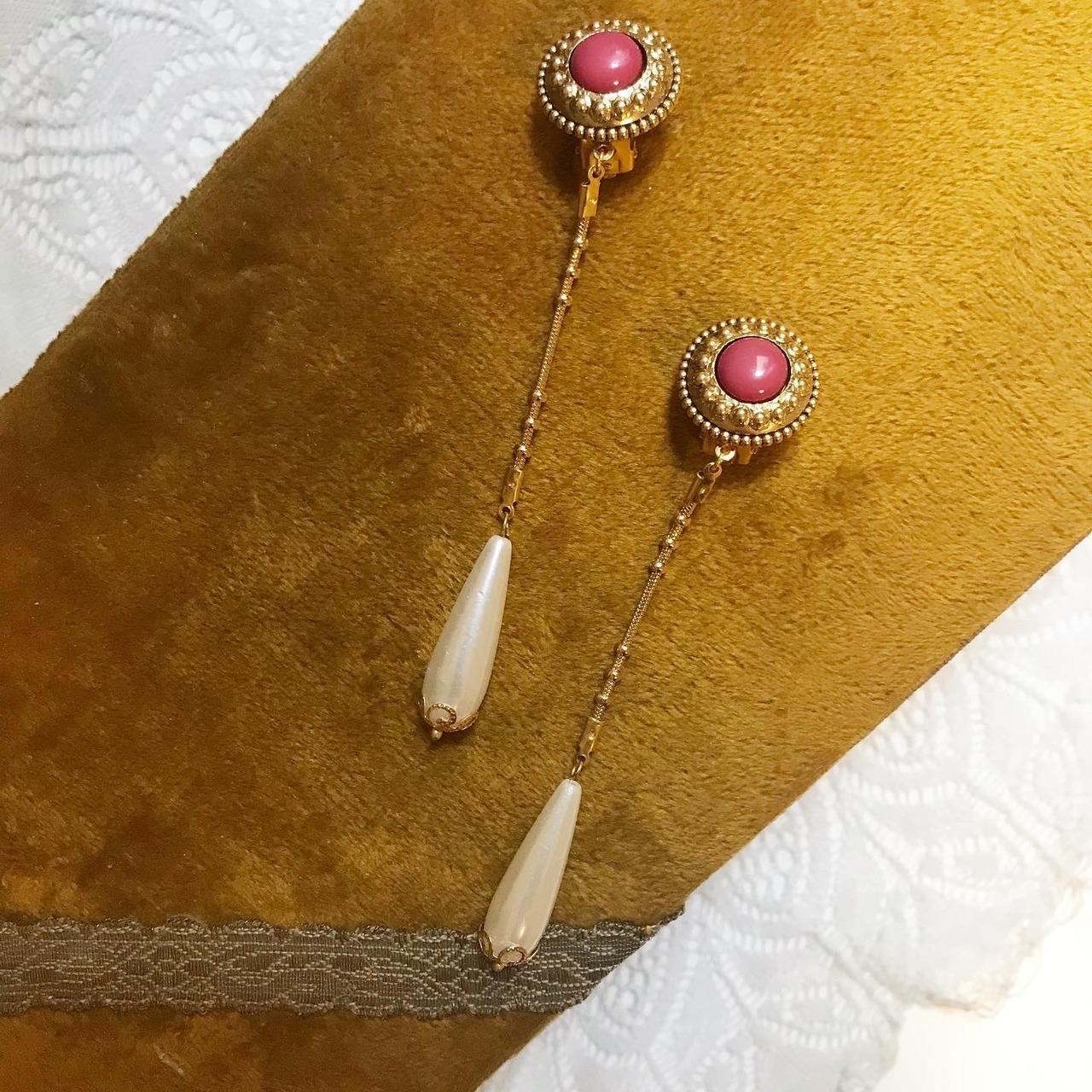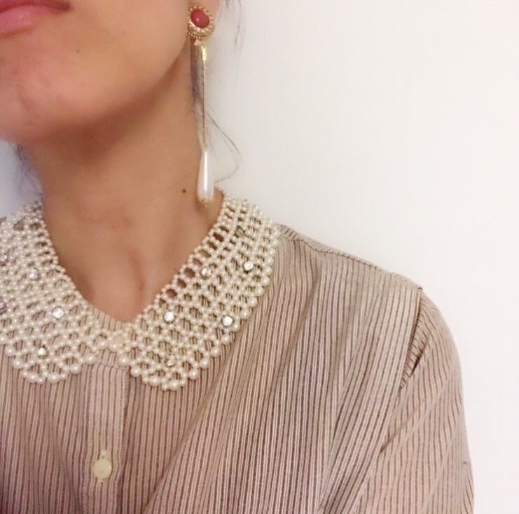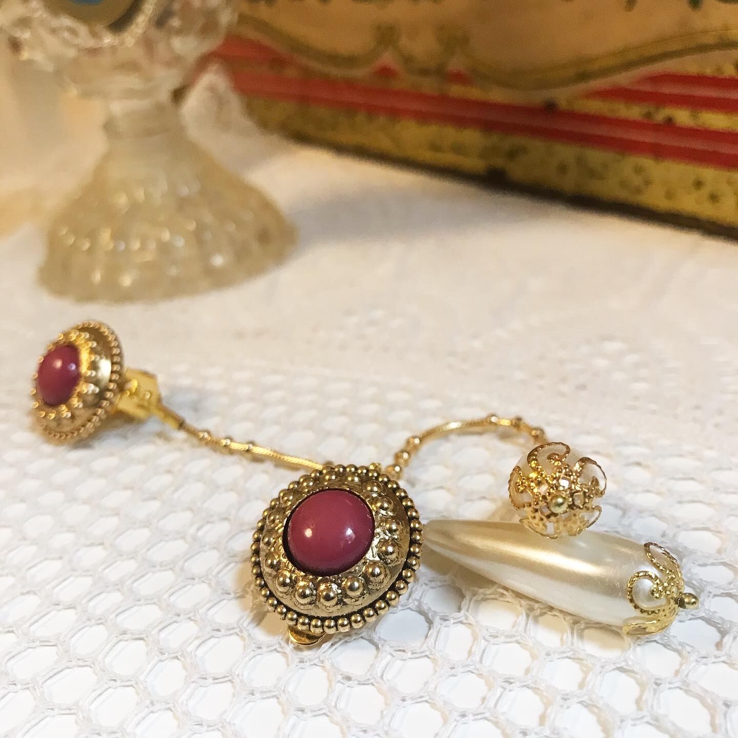 ツヤを抑えた上品なゴールドカラーのヴィンテージボタンと、同じく蚤の市で見つけたドロップ型のパールパーツをしなやかにしなるチェーンで繋ぎ合わせました 。۞·:⚪︎