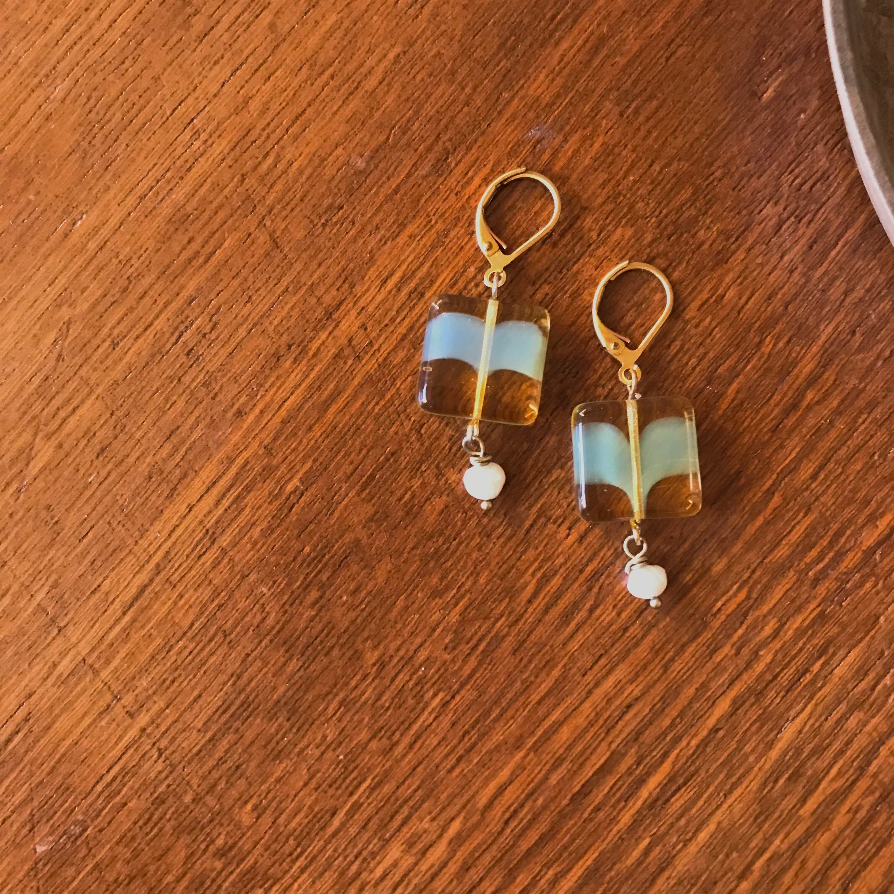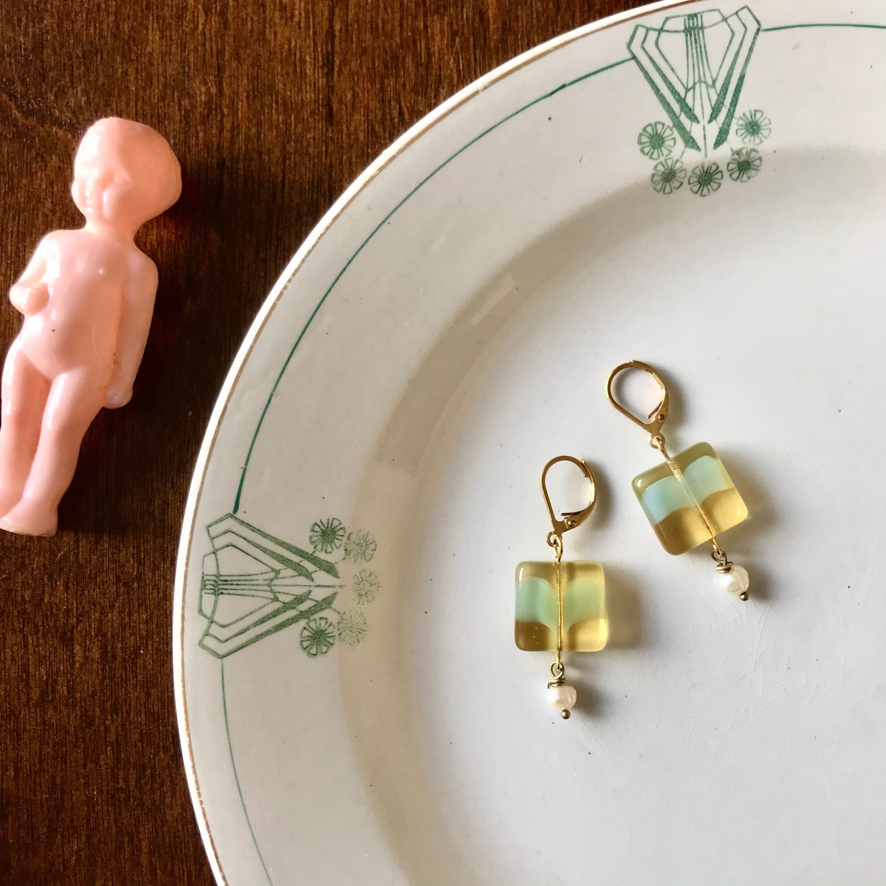珍しいパーツを使用しており、光が当たることで透明感のある輝きを放ちます。耳元で優雅に揺れるこのピアスは、シンプルなスタイルにも合わせやすく、普段使いから特別な場面まで幅広く活躍します。